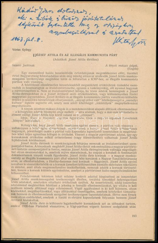 Vértes György: József Attila és az illegális kommunista párt. (Adalékok József Attila életéhez.) Különlenyomat az Irodalomtörténeti Közlemények 1963/2. számából. Bp., Akadémiai-ny., 193-218 p. Kiadói papírkötés.