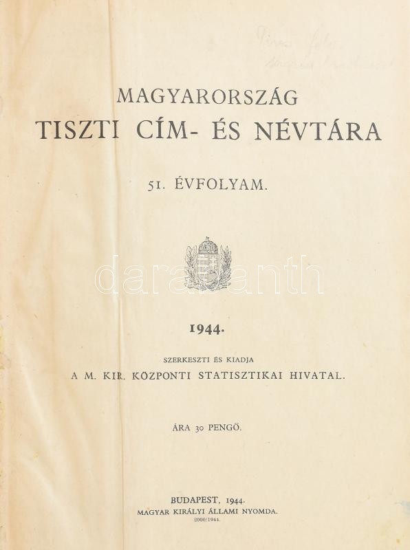 1944 Magyarország tiszti cím- és névtára. 51. évf. 1944. Szerk. és kiadja a M. Kir. Központi Statisztikai Hivatal. Bp., 1944., Magyar Királyi Állami Nyomda, 96+1062 p. Kiadói piros félvászon-kötés, kopott borítóval, a gerincen egészen kis sérüléssel.