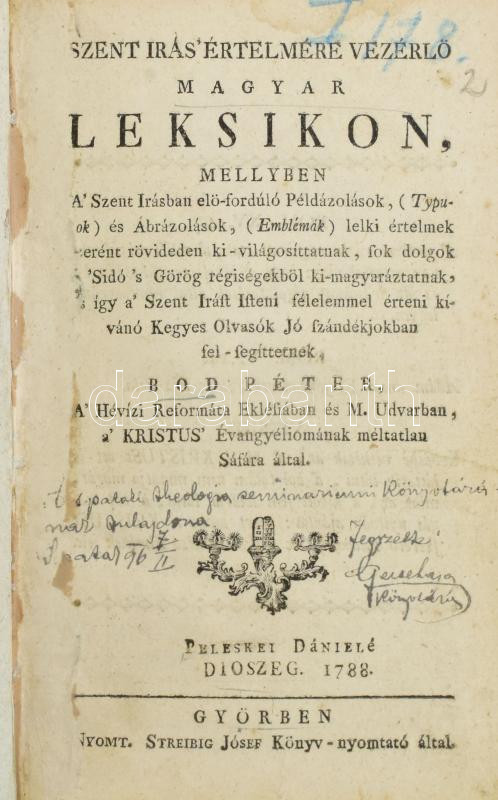 Bod Péter: Szent Irás értelmére vezérlő magyar leksikon, mellyben A Szent irásban elö-fordúló Példázolások, (Typusok) és Ábrázolások, (Emblémák) lelki értelmek szerént rövideden ki-világosíttatnak, sok dolgok a Sidó s Görög régiségekből ki-magyaráztatnak, Györben, 1788, Streibig. 23 sztl. lev. 312p. 13 sztl. lev. 1 t. (metsz.). A mű kolozsvári első, s fenti győri, második kiadása 1746-ban, csaknem egyidőben jelent meg. Igényes korhű kartonálásban, korabeli pecsételt ex librissel.