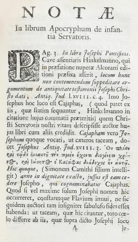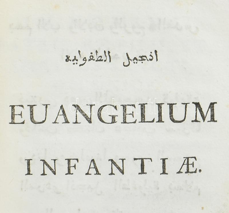 [Heinrich Siecke/Henry Sike (1668-1712)] Henricus Sike: Euangelium infantiae, vel Liber apocryphus de infantia Servatoris ex manuscripto edidit, ac latina versione et notis illustravit - -. Trajecti ad Rhenum (Utrecht), 1697, Franciscum Halmam - Guiljelmum vande Water, 22+161+7+93+1 p. Latin és arab nyelven. A címlapon rézmetszetű illusztrációval. Korabeli egészpergamen-kötésben, foltos borítóval, kissé foxing foltos lapokkal, jó állapotban.
