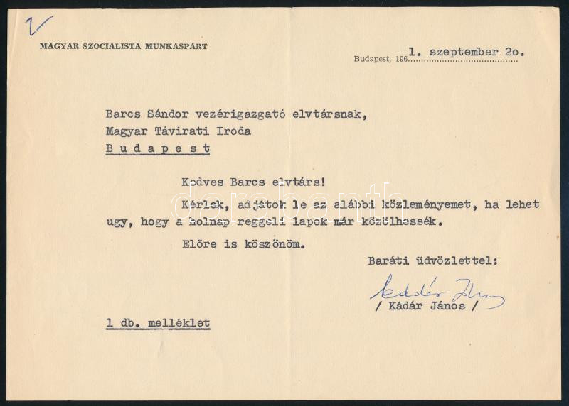 Leírás: 1961 Kádár János kommunista politikus, miniszterelnök által aláírt levél