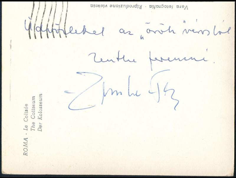 1962 Zenthe Ferenc (1920-2006) a Nemzet Színésze címmel kitüntetett, Kossuth-díjas és kétszeres Jászai Mari-díjas magyar színművész, érdemes és kiváló művész, a Halhatatlanok Társulatának örökös tagjának és feleségének, Zenthe Ferencné Oláh Katalinnak az aláírása egy üdvözlő képeslapon