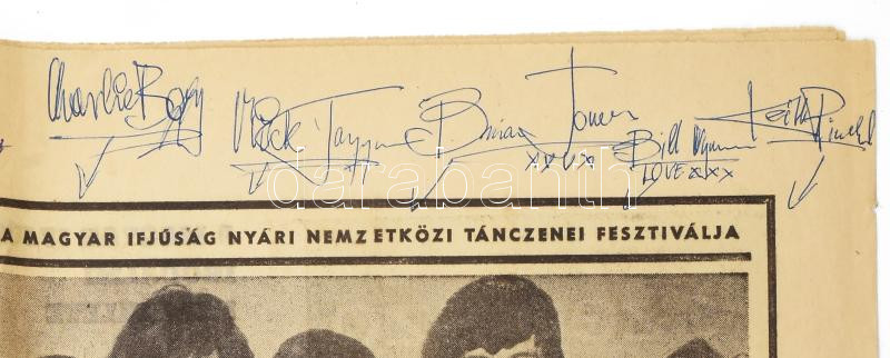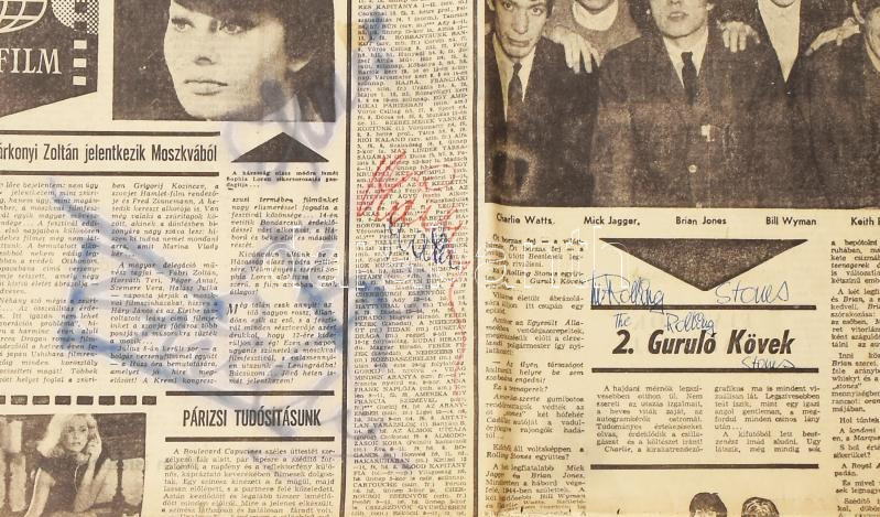 1966 The Rolling Stones a tagok, Mick Jagger, Keith Richards, Brian Jones, Billy Wyman és Charlie Watts által autográf dedikált Szép Szó c. újság a zenekarról szóló cikkel / Autograph signatures of the members of The Rolling Stones: Mick Jagger, Keith Richards, Brian Jones, Billy Wyman and Charlie Watts on a Hungarian newspaper article about the band