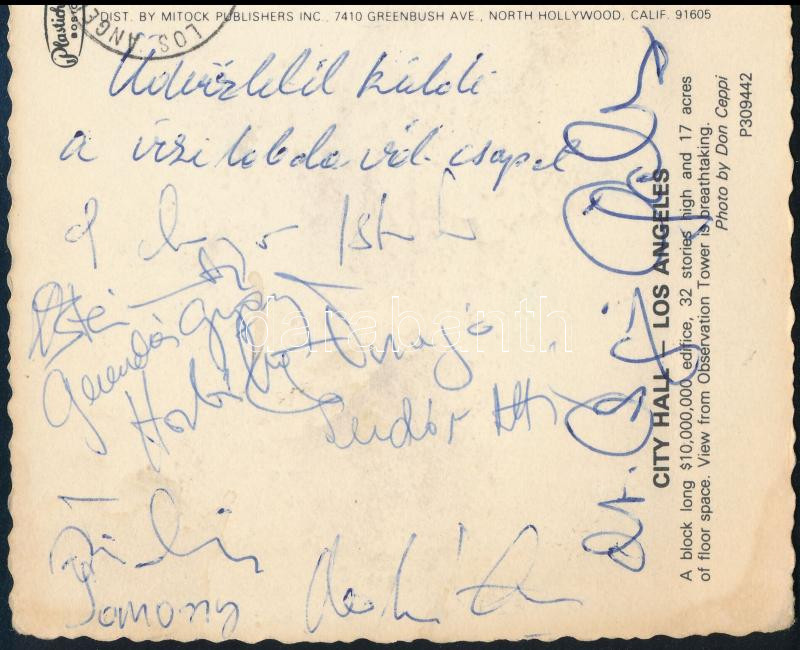 1978 Los Angeles, Magyar férfi vízilabda válogatott tagjai által aláírt képeslap, közte Csapó Gábor, Gerendás György, Sudár Attila, Somossy József, Horkai György, Faragó Tamás, Steinmetz János és mások aláírásaival.