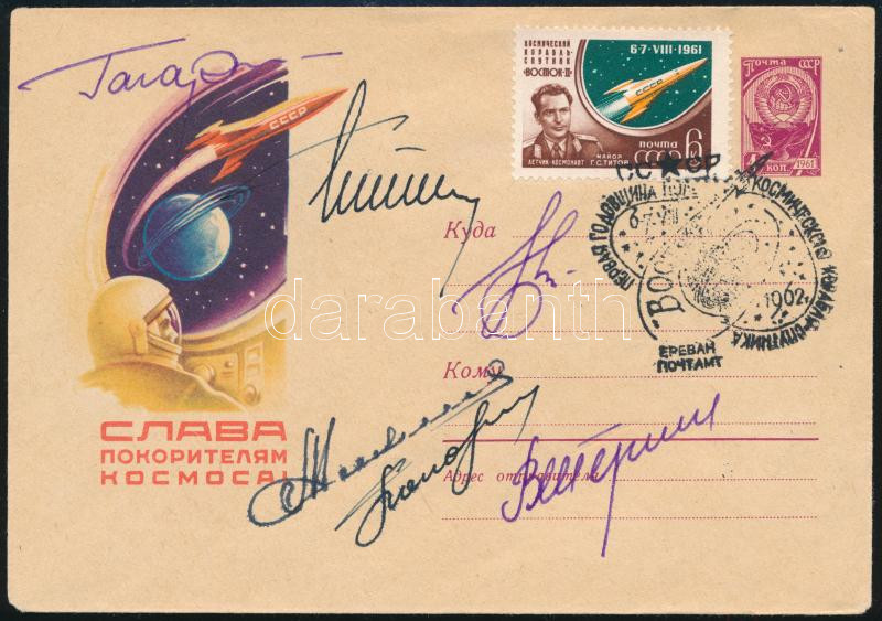 Leírás: Jurij Alekszejevics Gagarin (1934-1968), Valentyina Vlagyimirovna Tyereskova (1937- ), Valerij Bikovszkij (1934- ), Adrijan Nyikolajev (1929-2004), German Tyitov (1935-2000) és Pavel Popovics (1930-2009) szovjet űrhajósok aláírásai emlékborítékon / Signatures of Yuriy Alekszeyevich Gagarin (1934-1968), Valentina Tereshkova (1937- ), Valeriy Bikovskiy (1934- ), Adriyan Nikolayev (1929-2004), German Titov (1935-2000) and Pavel Popovich (1930-2009) Soviet astronauts on envelope