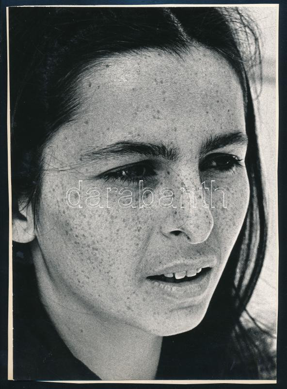 1973 Markó Kamilla győri fotóművész feliratozott, vintage fotóművészeti alkotása (Lány), ezüst zselatinos fotópapíron, a kép a Népművelési Intézet által, Győrben megrendezett fotós alkotótelep (eredeti fotókat tartalmazó) albumából származik, a felirat átvilágítva olvasható, albumlapra felragasztva, 21x15 cm