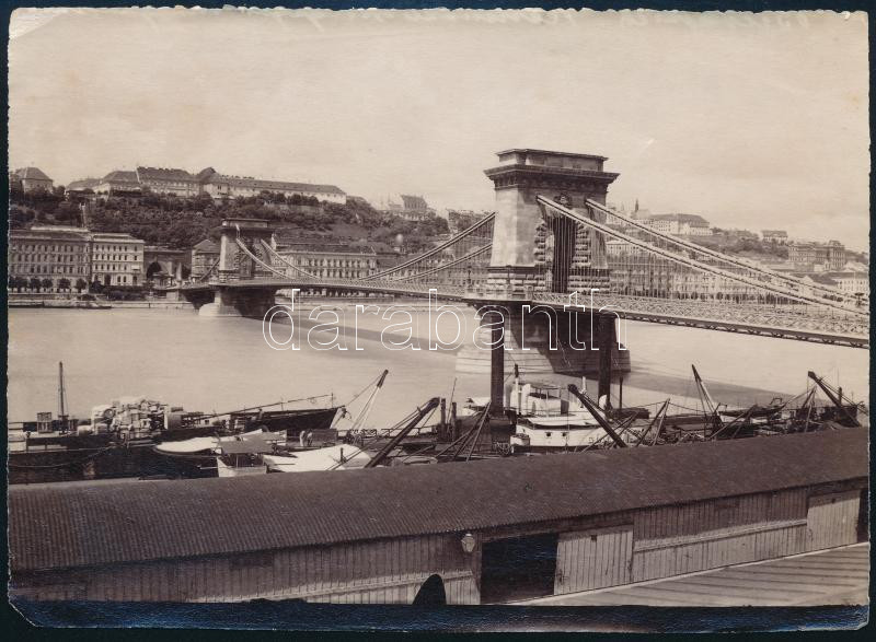 cca 1880 Lánchíd, a háttérben a budai várheggyel, fotó, Alois Beer, K. u. K. Hofphotograph Klagenfurt, a hátoldalán feliratozva és pecséttel jelzett, az egyik alsó sarkán hiánnyal, a felső szélén egészen apró sérülésekkel, 11x15 cm