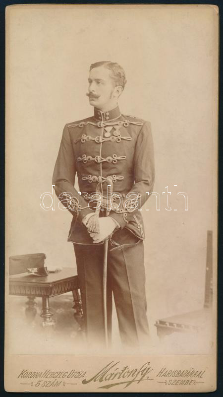 cca 1900 Császár Imre (1864-1933) színész, Alszeghy Irma színésznő férje, színiakadémiai tanár katonaruhás portréfotója, keményhátú fotó Mártonfy Gyula budapesti műterméből, 21x11,5 cm