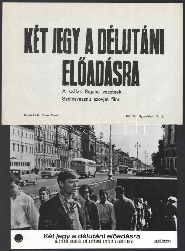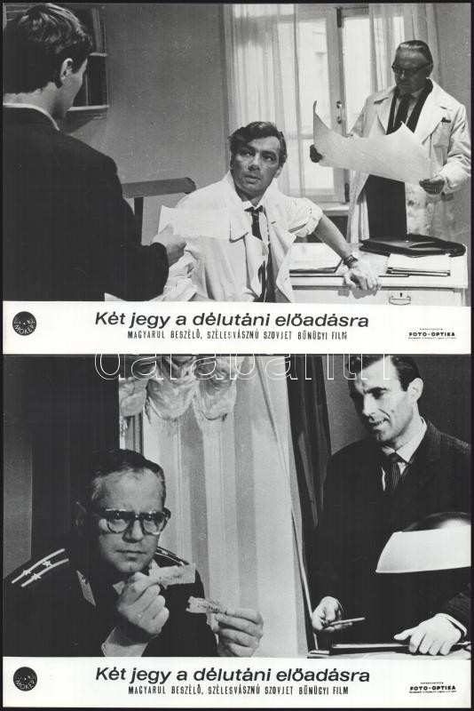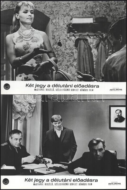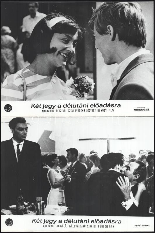 cca 1965 ,,Két jegy a délutáni előadásra" című szovjet film jelenetei és szereplői, 23 db vintage produkciós filmfotó ezüst zselatinos fotópapíron, a használatból eredő (esetleges) kisebb hibákkal, + hozzáadva 1 db szöveges kisplakát, 18x24 cm