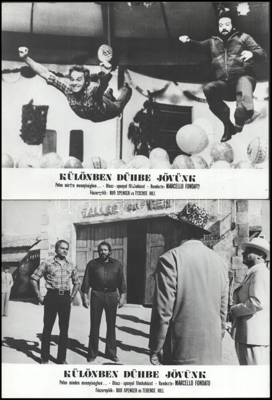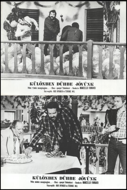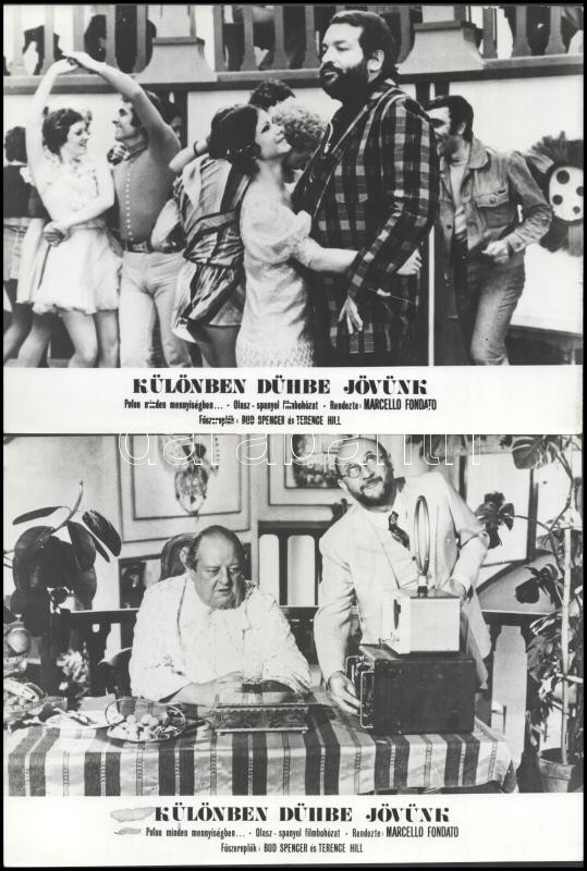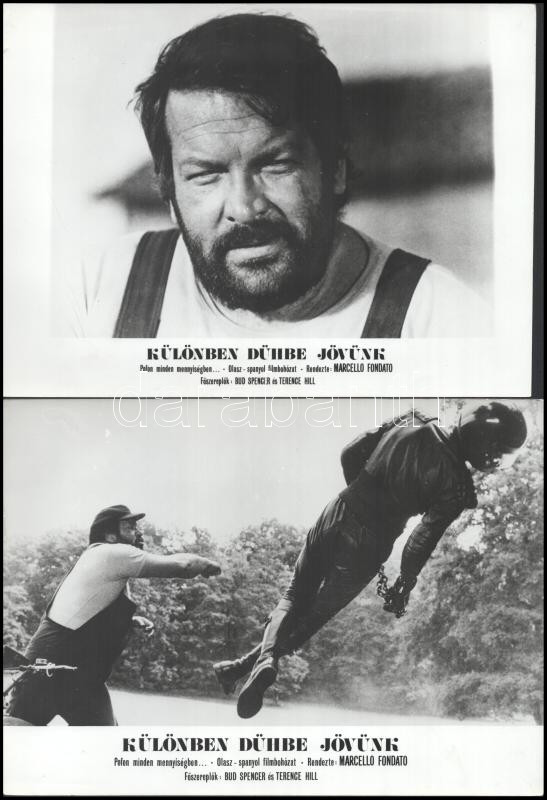 cca 1974 ,,Különben dühbe jövünk" című olasz - spanyol filmbohózat jelenetei és szereplői (Bud Spencer és Terence Hill főszereplésével), 10 db vintage produkciós filmfotó ezüst zselatinos fotópapíron, a használatból eredő (esetleges) kisebb hibákkal, 18x24 cm