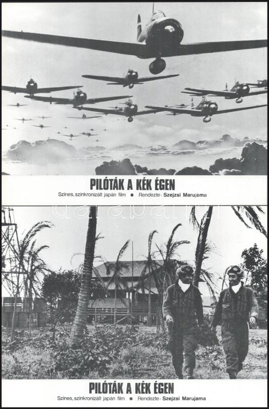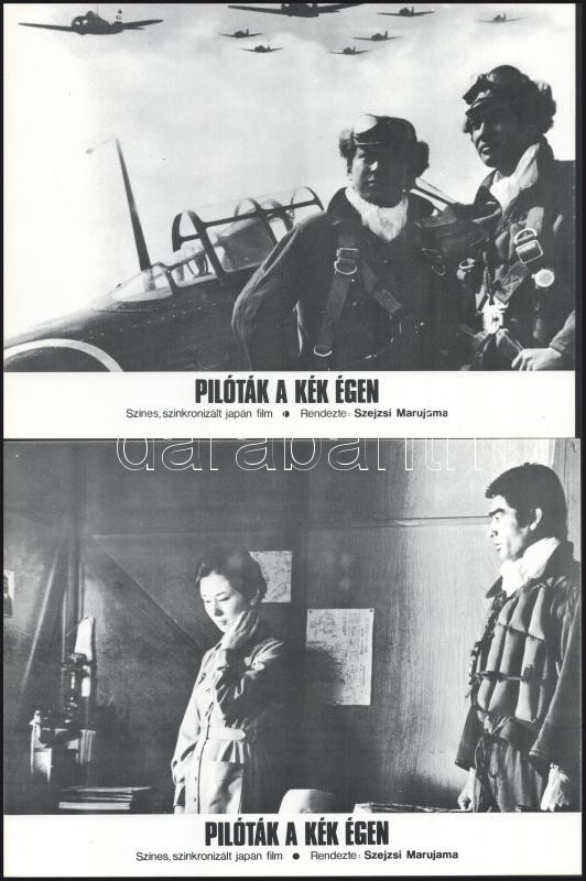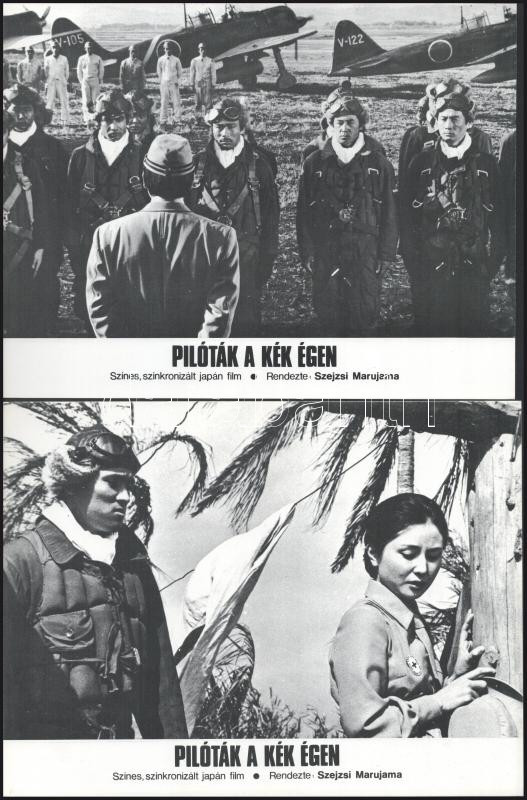 cca 1976 ,,Pilóták a kék égen" című japán film jelenetei és szereplői, 10 db produkciós filmfotó nyomdatechnikával sokszorosítva kartonpapírra (nyomat), egyoldalas nyomással, a használatból eredő (esetleges) kisebb hibákkal, 18x24 cm