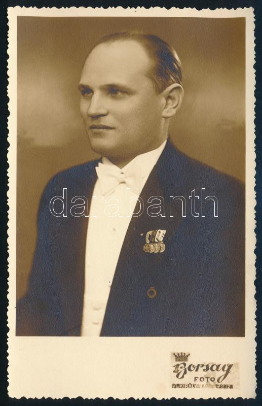 cca 1940 Katonaviselt úriember öltönyben, miniatűr kitüntetés sorral 9... https://www.darabanth.com/hu/41-Nagyaukcio/41.1/Mutargy-papirregiseg-egyeb/Militaria~16790/cca-1940-Katonaviselt-uriember-oltonyben-miniatur-kituntetes-sorral-9x14-cm~II3004346