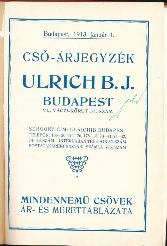 1913 Ulrich B. J. Cső-árjegyzék.1913. jan. 1. Mindennemü csövek ár- és mérettáblázata. Bp.,1913,Kührner Vilmos-ny., 271+1 p. Kiadói aranyozott egészvászon-kötés, jó állapotban.