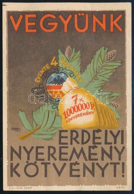 1941 Vegyünk erdélyi nyereménykötvényt, reklámlap, szignózott Richter ... https://www.darabanth.com/hu/41-Nagyaukcio/41.1/Mutargy-papirregiseg-egyeb/Reklam~16787/1941-Vegyunk-erdelyi-nyeremenykotvenyt-reklamlap-szignozott-Richter-A-12-5C3978-5-cm~II3002262