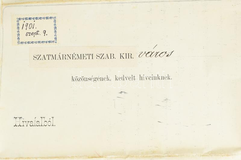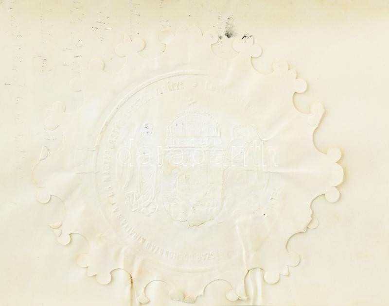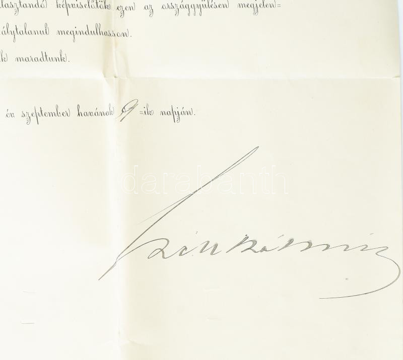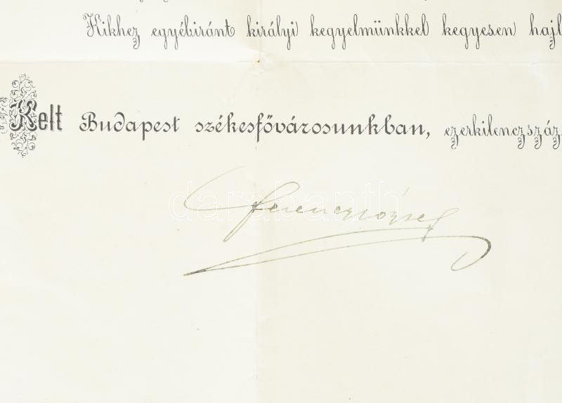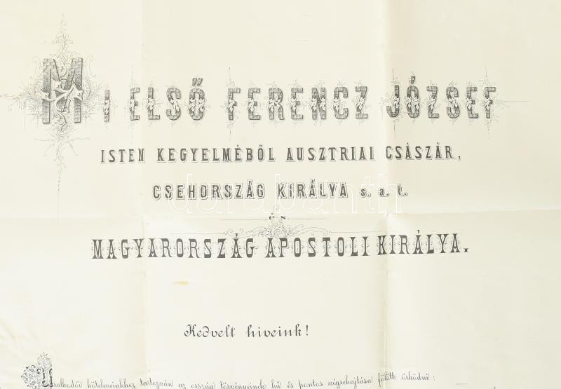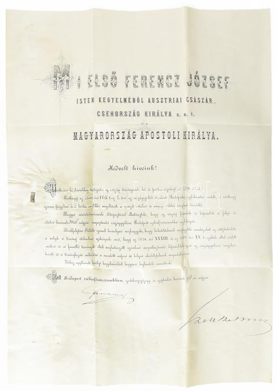 1901 Országgyűlési meghívó. Ferenc József (1830-1916) király és Széll Kálmán (1843-1915) miniszterelnök által autográf aláírt meghívó az 1910. évi Országgyűlésre Szatmárnémeti városa részére. Papírfelzetes viaszpecséttel, hajtva. / Invitation for the National Assembly with autograph signatures of the Emperor Franz Joseph and Prime Minister Kalman Széll to the city of Satu-Mare 39x55 cm