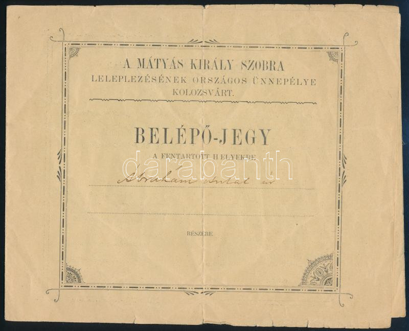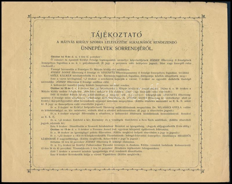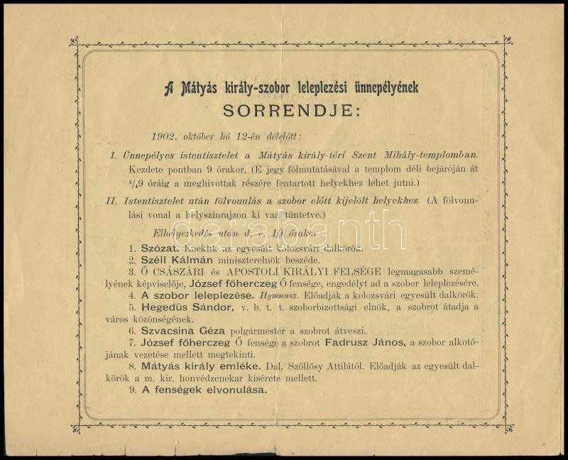 1902 A Mátyás király szobra leleplezésének országos ünnepélye Kolozsvárt. Névre-szóló belépő-jegy és programfüzet, az utolsó oldalon a helyszín térképével, hajtott, 4 p.