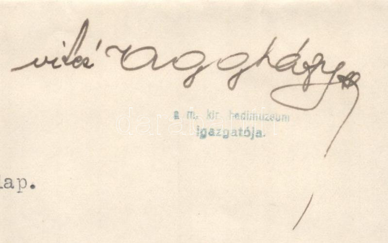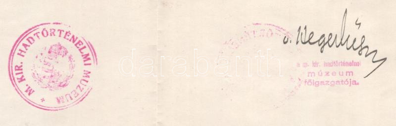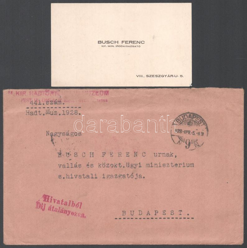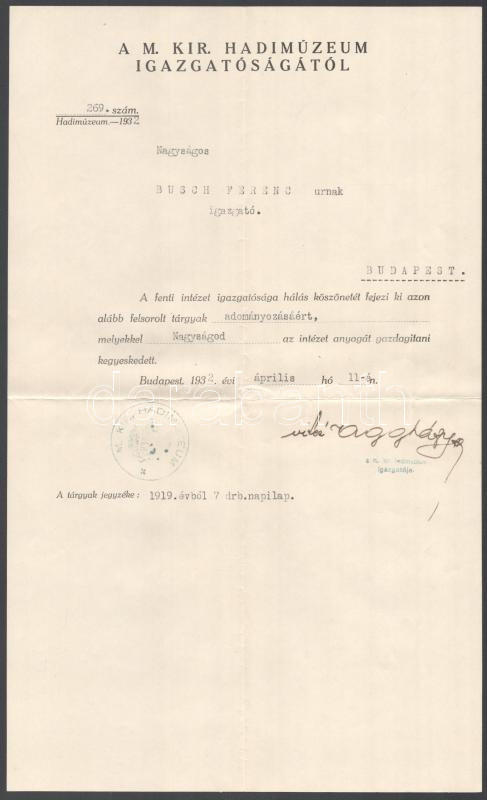 1928-1932 M. Kir. Hadimúzeum / M. Kir. Hadtörténelmi Múzeum gépelt adományt megköszönő levele Busch Ferenc vallás- és közoktatásügyi minisztériumi s.hivatali igazgató/igazgató részére, Hegedűs Elek tábornok főigazgató és Aggházy Kamil ezredes (1882-1954) igazgató autográf aláírásaival, pecsétekkel, az egy eredeti borítékkal (1928), valamint Busch Ferenc névjegykártyájával.
