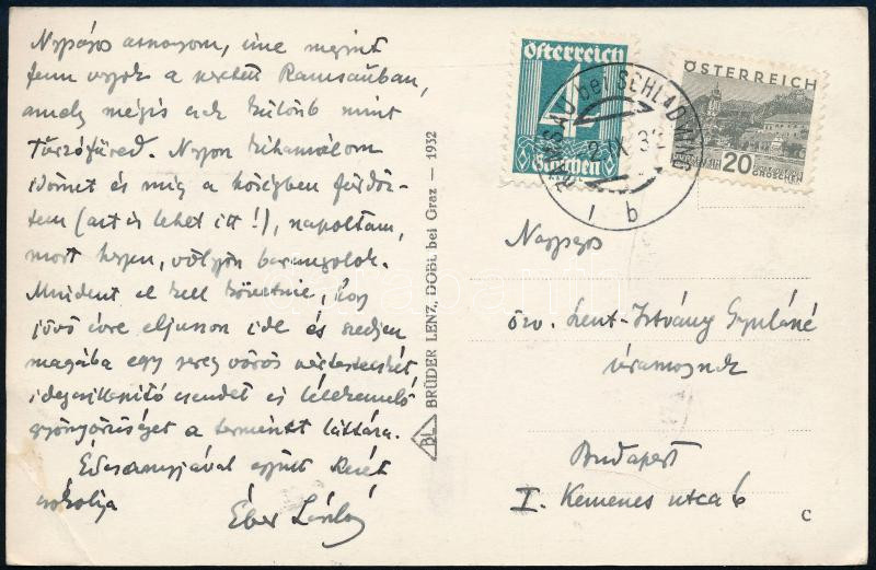 Leírás: 1932 Ramsau, Éber László (1871-1935) művészettörténész, műfordító saját kézzel írt képeslapja özv. Szent-Ivány Gyuláné részére