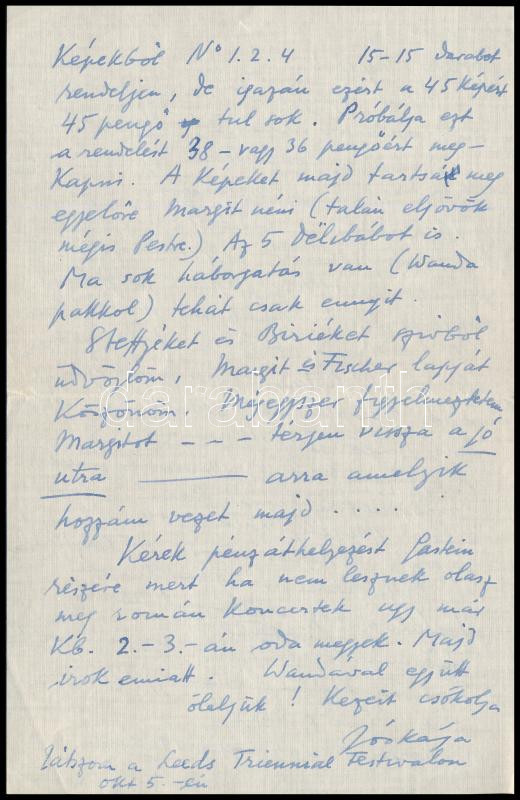 1934 Szigeti József (1892-1973) világhírű hegedűművész saját kézzel írt levele, saját kezű aláírásával, borítékkal, Oppenheim Henrikné Schmidl Margit részére, benne "... Itt küldöm a Liszt levelet, kérem Kunt vagy Mohácsit , hogy válaszoljanak a melléklet levélpapíron. ... Kéretem Kunt, hogy a Munkácsy képekből N. 1. 2. 4. 15-15 darabot rendeljen, de igazán ezért a 45 képért 45 pengő tul sok." (Kun = Kun Imre (1892-1977) hangversenyszervező.)