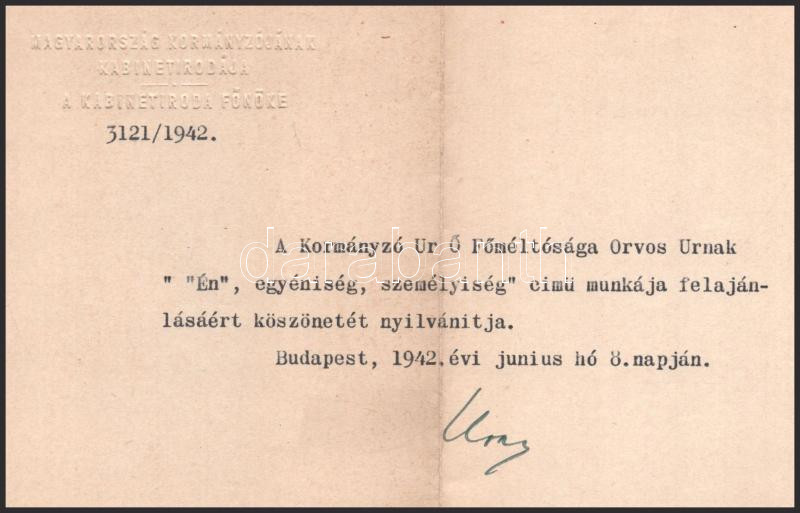 1942 Dr. Völgyesi Ferenc (1895-1967) orvos, pszichiáter és hipnotizőrnek írt levél Horthy Miklós kormányzó kabinetiodája vezetőjének, Uray István aláírásával, melyben a kormányzó nevében megköszöni Én, egyéniség, személyiség c. munkájának megküldését.