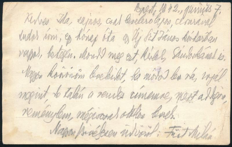 1942 Füst Milán (1888-1967) író, költő autográf levelezőlapja Solymos Ida (1922-1995) költőnek, melyben arról ír, hogy egy hónapja kórházban fekszik betegen.