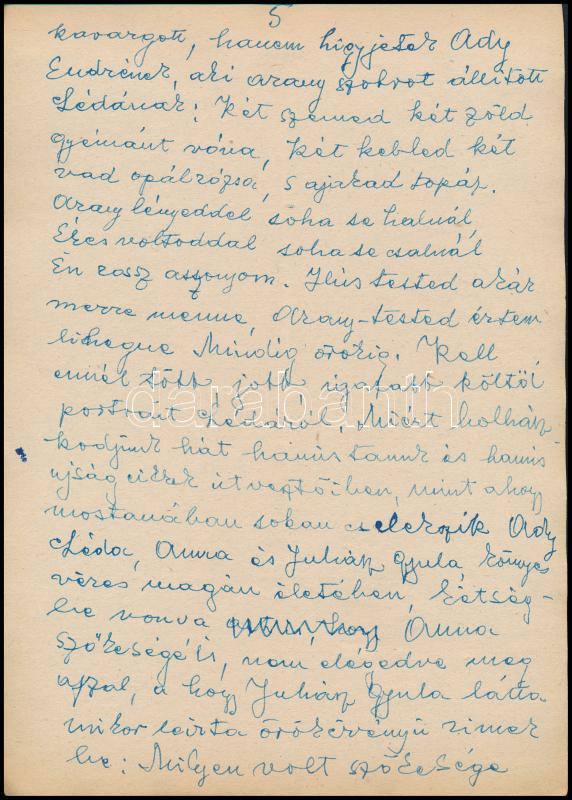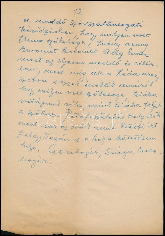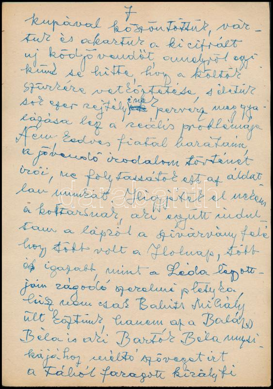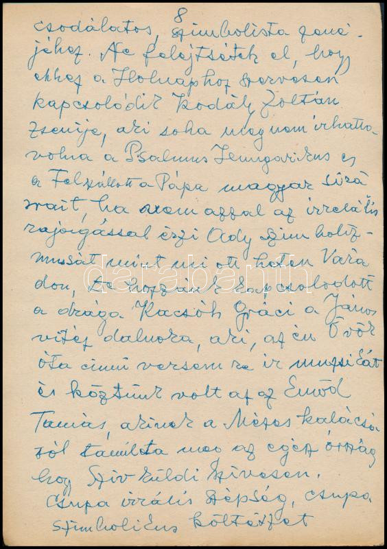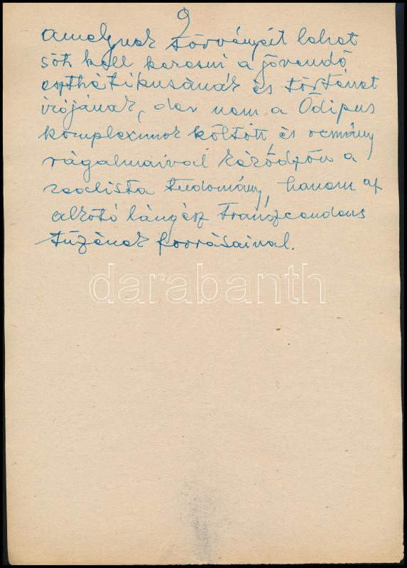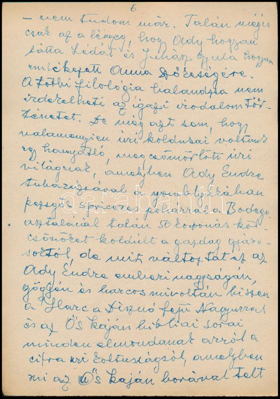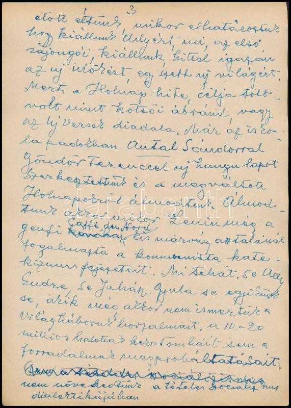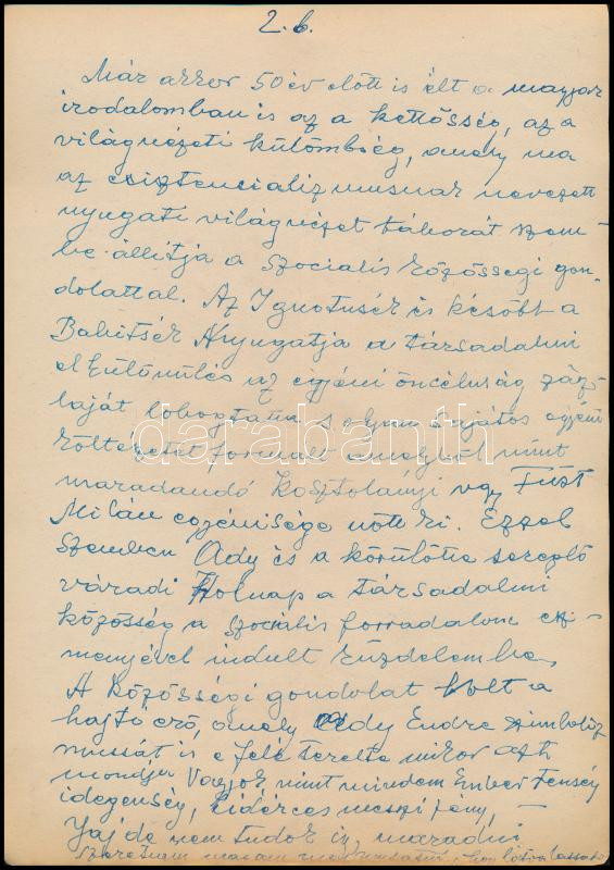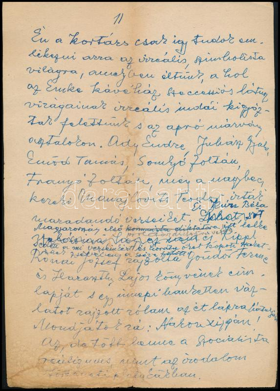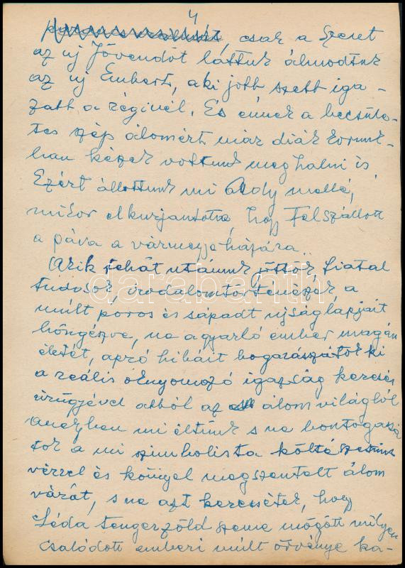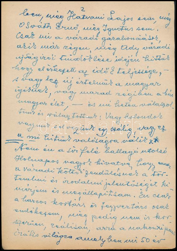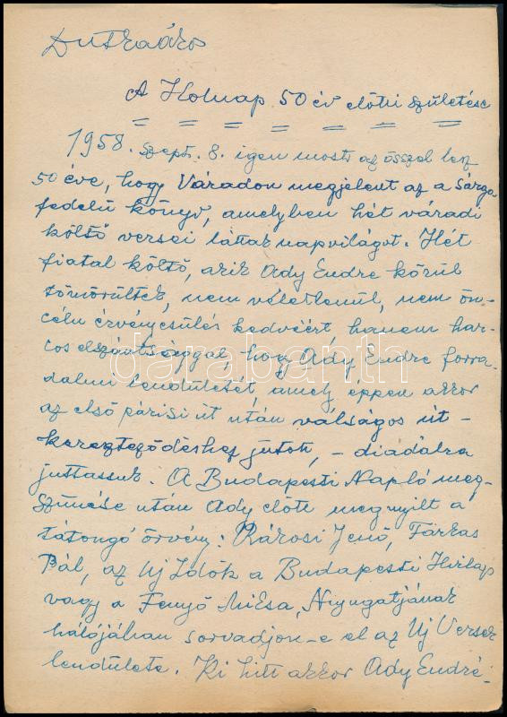 1958 Dutka Ákos (1881-1972) költő, író saját kézzel írt, "A Holnap 50 év előtti születése" c. megemlékező írásának kézirata, aláírással, 12 beírt oldal. A Holnap irodalmi antológiát 1908-ban 7 költő, Ady Endre, Babits Mihály, Balázs Béla, Dutka Ákos, Emőd Tamás, Juhász Gyula és Miklós Jutka alapította Nagyváradon. A Holnap programja radikálisabb volt, mint a Nyugaté. Érdeme, hogy a modern és a konzervatív irodalmi tábor között éles vonalat húzott.