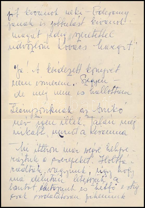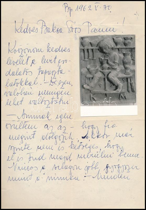 1962 Kovács Margit (1902-1977) Kossuth-díjas keramikus saját kézzel írt levele, Baksa-Soós Anna részére, saját kezű aláírásával, rajta egy munkáját ábrázoló fotóval, fotó: 11x8 cm, 2 beírt oldal