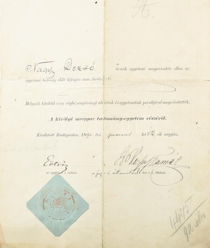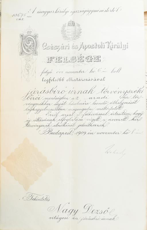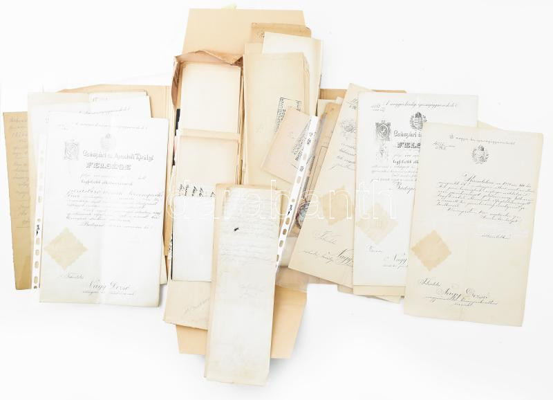 cca 1885-1948 Nagy Dezső (1868-1948 után) jogász, törvényszéki bíró okmányai, kinevezései bíróvá klf. erdélyi (Élesd, Nagyvárad, Világos, Arad) városokba az aktuális igazságügyi miniszterek és államtitkárok, Trianon után román miniszterek aláírásaival valamint egyéb híres tudósok aláírásai egyetemi okmányokon: 1909 Wekerle Sándor (1878-1963) pénzügyminiszter (és miniszterelnök) autográf aláírása; 1907 Günther Antal (1847-1920) igazságügyminiszter autográf aláírása; 1892 Eötvös Loránd (1848-1919) a Budapesti Tudományegyetem rektora (1891-1892) és Vécsey Tamás (1839-1912) dékán végbizonyítványon; 1888 Klinger István (1831-1908) a Budapesti Tudományegyetem rektora és Hajnik Imre (1840-1902) dékán egyetemi okmányon; Vécsey Tamás, Hajnik Imre, Bochkor Károly (1847-1918), Kerékgyártó Árpád (1818-1902), Pulszky Ágost (1846-1901), Lechner Ágost (1834-1901), Herczegh Mihály (1840-1926), Kerkapoly Károly (1824-1891), Schnierer Aladár (1836-1898), Plósz Sándor (1846-1925) későbbi igazságügy-miniszter, Kautz Gyula (1829-1909) és mások autográf aláírásai indexben. 1893 Czorda Bódog (1828-1904) igazságügyi államtitkár (1889-1892), 1893-tól 1901-ig a Kúria másodelnöke 2 db autográf aláírása okmányokon. 1914 Nagy Dezső levele gróf Széchényi Miklós (1868-1923) nagyváradi püspökhöz.1948 visszahonosítási okirat, szegénységi hatósági bizonyítvány és más visszahonosításhoz kötődő okmány. Sok egyéb érdekes okmánnyal, kézirattal, önéletrajzzal, össz. közel 100 db papírrégiség és 11 db régi fotó. Érdekes, átnézésre több mint érdemes anyag!