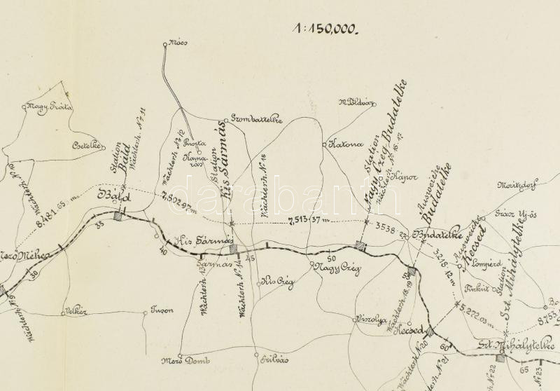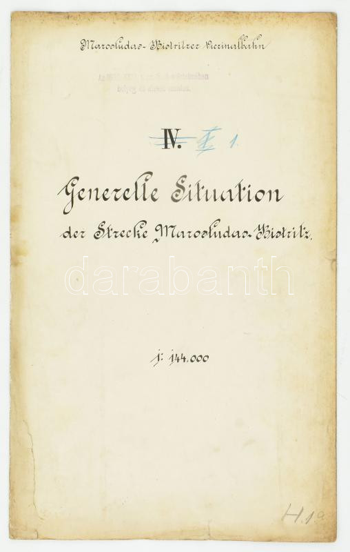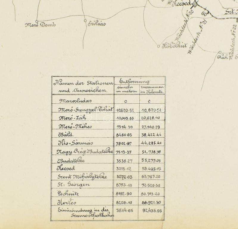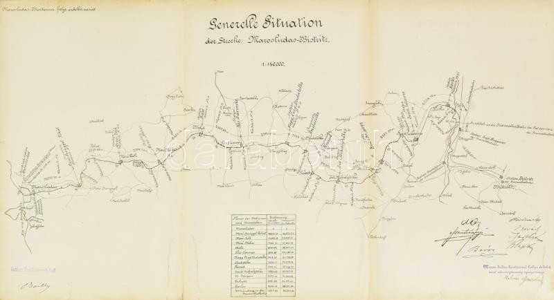 cca 1890 Marosludas-besztercei (erdélyi) helyi érdekű vasút vonaltérképe (Generelle Situation der Strecke: Marosludas-Bistritz), korabeli sokszorosítás, a térkép alatt táblázatban az állomások neveivel, Marosludas-besztercei (erdélyi) Helyi Érdekű Vasút Rt. igazgatósága bélyegzőjével, alatta két autográf aláírással (Molnár és olvashatatlan), 1:150.000, szakadásokkal, máskülönben jó állapotban, 34x63 cm / cca 1890 map of the railway Ludus-Bistrita in Transylvania, 1:150.000, with tears, 34x63 cm
