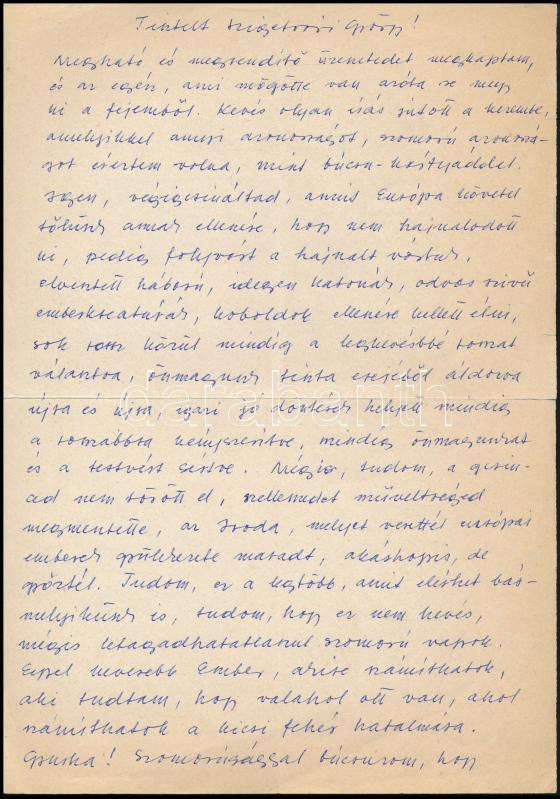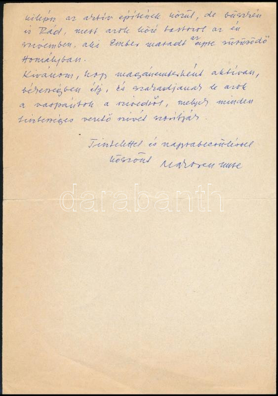 cca 1980 Makovecz Imre (1935-2011) építész autográf levele Szigetvári György (1926-2018) Ybl Miklós-díjas építészmérnöknek melyben Szigetvári építész kamarából való kilépése feletti sajnálkozását fejezi, azt történelmi keretbe ágyazva. Érdekes írás. 1,5 beírt oldal