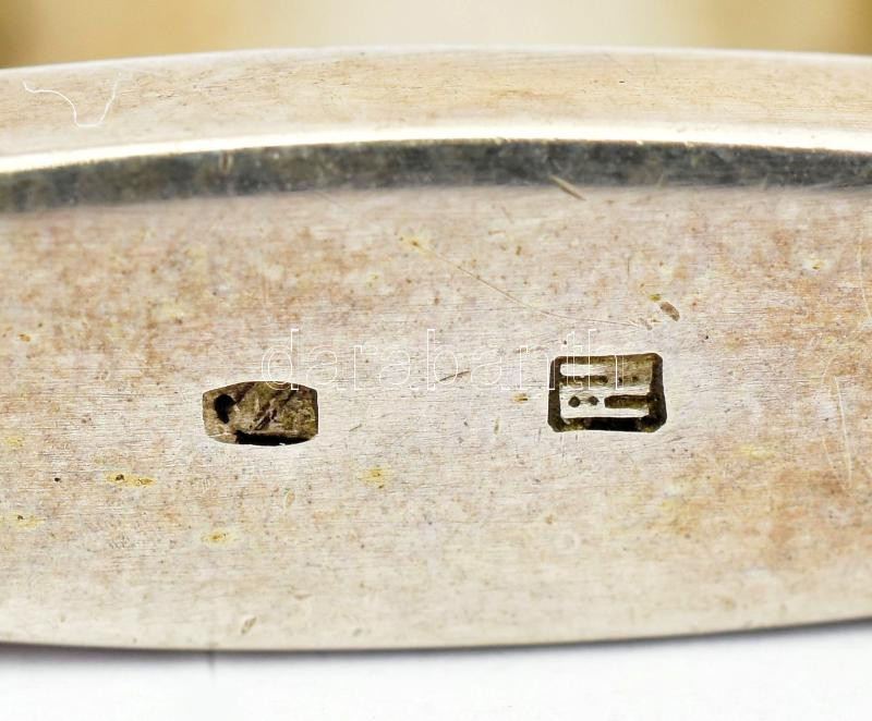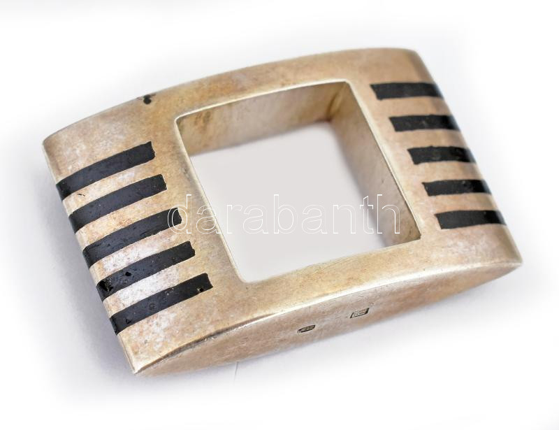 Ezüst(Ag) Jermakov Katalin (1969-) által tervezett szögletes gyűrű ében berakással, jelzett, méret: 48, bruttó: 23,3 g, reprodukálva a Horváth-Kelényi-Buzinkay-Ébli: Értékmentő szenvedély című könyv 236. oldalán. Kiállítva: Bp., 2008, Iparművészeti Múzeum.