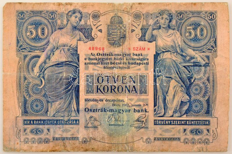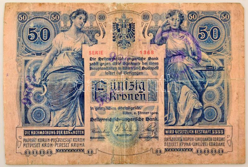 Leírás: 1902. 50K "1368 48968" kiolvashatatlan felülbélyegzéssel T:VG nagyobb szakadások, foltok / Hungary 1902. 50 Korona "1368 48968" with unreadable overprint C:VG with larger tears, spots Adamo K23B, Krause P#24