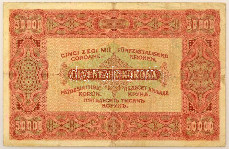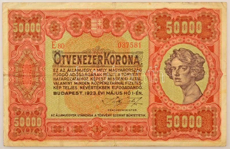 1923. 50.000K nyomdahely jelölés nélkül, piros sor- és sorozatszám "E80 037581" T:F,VG / Hungary 1923. 50.000 Korona without printer's mark, red serial "E80 037581" C:F,VG Adamo K45, Krause P#71