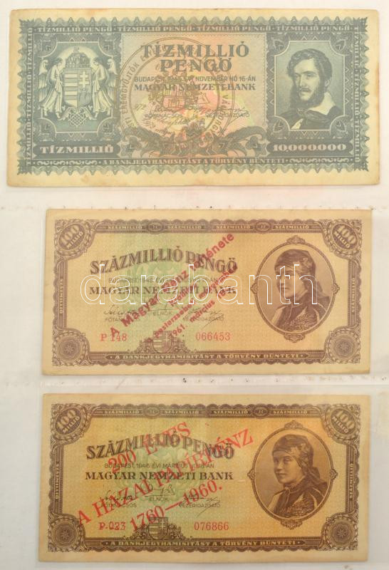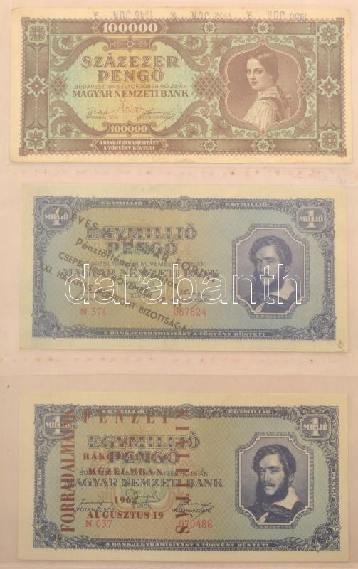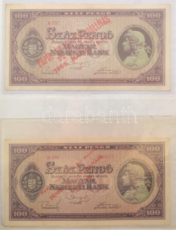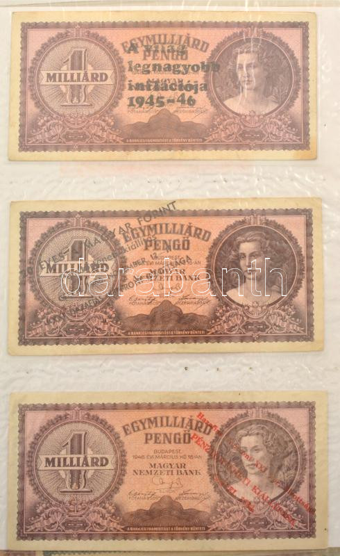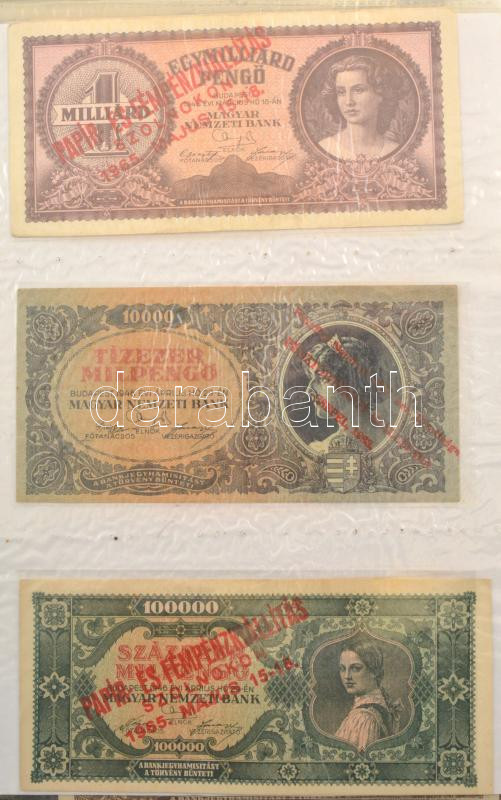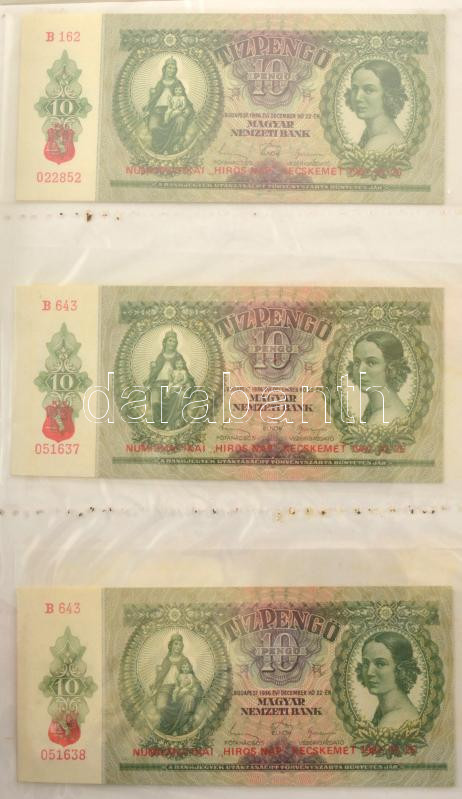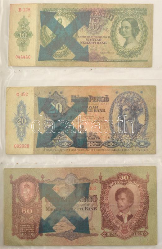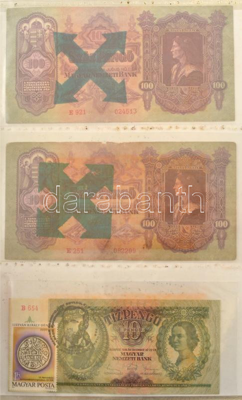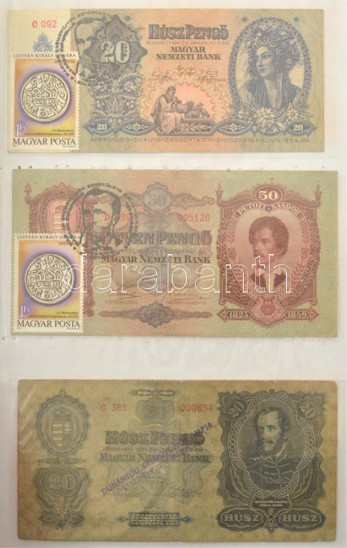 1930-1946. 62db-os pengő bankjegy tétel mind, többségében valamelyik numizmatikai találkozó, kiállítás felülbélyegzésével vagy bélyeggel ellátva, többek között "200 éves a hazai papírpénz 1760-1960", "Forradalmi Pénzkiállítás Dorog 1967.", "A Magyar Pénz története kiállítás a pesterzsébeti múzeumban 1961." stb., valamint hamis bélyegzések is találhatóak a gyűjteményben, többek között hamis zöld nyilaskeresztes "Városi Pártvezető Sopron" felülbélyegzés és Német Harmadik Birodalmi bélyegzés + 1849. 2Ft "Kincstári utalvány" imitációja és egy fénykép az 1848-as nyomólemezről. Tartalmas gyűjtemény mappába rendezve T:UNC-VG / Hungary 1930-1946. A lot of 62 Pengő banknotes with overprints or stamps mostly from numismatic meetings, exhibitions, as well as fake overprints can be found in the collection, including a fake green Nyilas "Városi Pártvezető Sopron" overprint and a German Third Reich overprint + 1849. 2 Forint "Treasury voucher" imitation and a photo of the 1848. printing plate. Content collection arranged in a folder C:UNC-VG