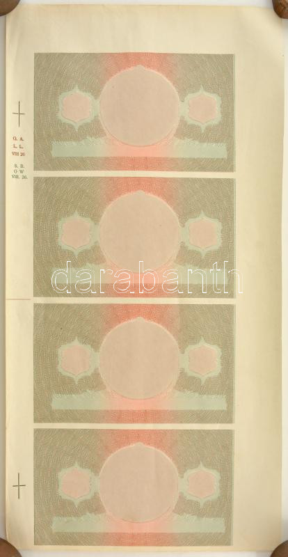 1941. 20P hátlapi fázisnyomat 4db-os ívben, látható illesztőkerettel, augusztus 26-i dátummal T:hajtatlan, feltekerve / Hungary 1941. 20 Pengő back progress proof in a sheet of 4, with visible typographical frame and 26th August date C:unfolded, rolled up