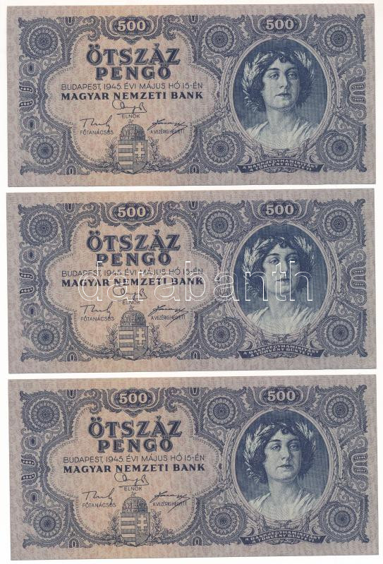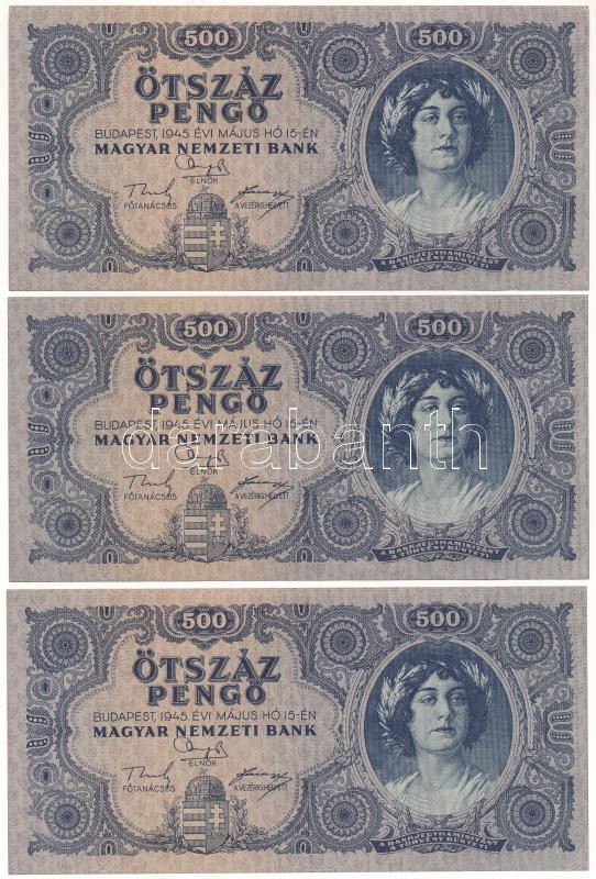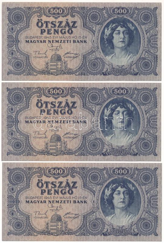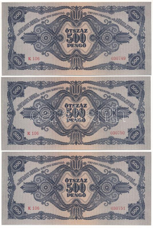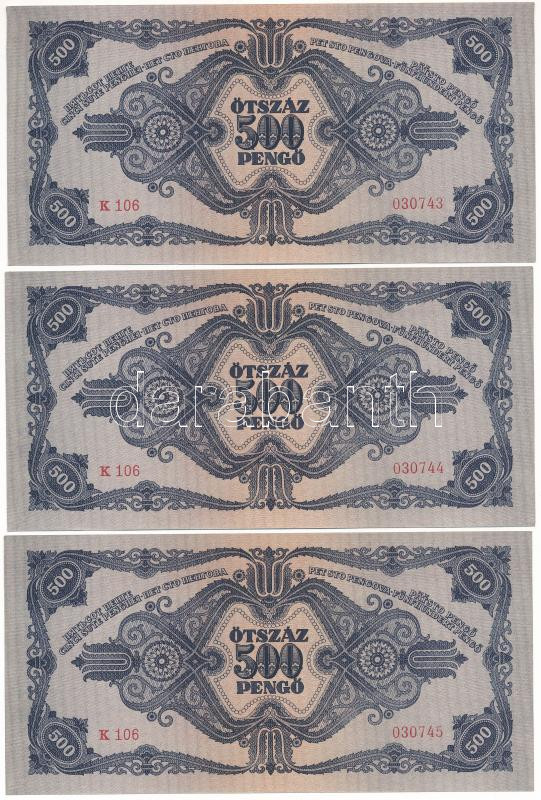 Leírás: 1945. 500P (10x) sorszámkövetők "K 106 0307343 - K 106 0307352" T:AU / Hungary 1945. 500 Pengő (10x) consecutive serials "K 106 0307343 - K 106 0307352" C:AU