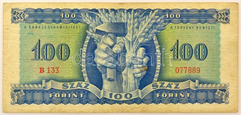 1946. 100Ft "B 133 077889" T:F erős papír / Hungary 1946. 10... https://www.darabanth.com/hu/41-Nagyaukcio/41.1/Numizmatika/Magyar-bankjegyek~16829/1946-100Ft-B-133-077889-TF-eros-papir-Hungary-1946-100-Forint-B-133-077889-CF-strong-pap~II2991398