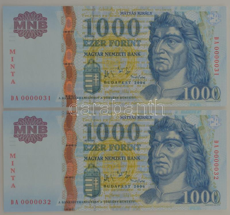 2006. 1000Ft (2x) sorszámkövetők "DA 0000031 - DA 0000032", ... https://www.darabanth.com/hu/41-Nagyaukcio/41.1/Numizmatika/Magyar-bankjegyek~16829/2006-1000Ft-2x-sorszamkovetok-DA-0000031-DA-0000032-piros-MINTA-felulnyomassal-TUNC-~II3004989