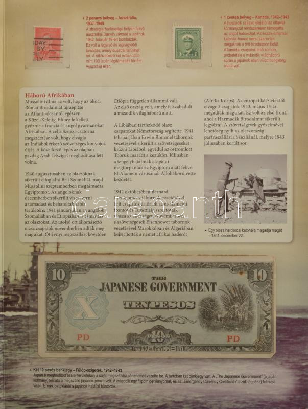 1939-1945. "A második világháború - A történelem legnagyobb háborús konfliktusa". Igényes, sorszámozott, színes kiadvány eredeti relikviákkal, többek közt 6db bankjeggyel, 3db szükségpénzzel, 16db érmével, 35db bélyeggel, 2db részvénnyel, stb., közte Gibraltár 2020. 1P Au "A békekötés 75. évfordulója" (0,5g/0,999/11mm) T:vegyes / 1939-1945. "World War II - The Biggest War Conflict in History" in Hungarian language. Demanding, numbere, colored publication with original relics, including 6pcs banknotes, 3pcs necessity money / notgeld, 16pcs coins, 35pcs stamps, 2pcs shares, etc., including Gibraltar 2020. 1 Pound Au "75th anniversary of the peace treaty" (0,5g/0.999/11mm) C:mixed