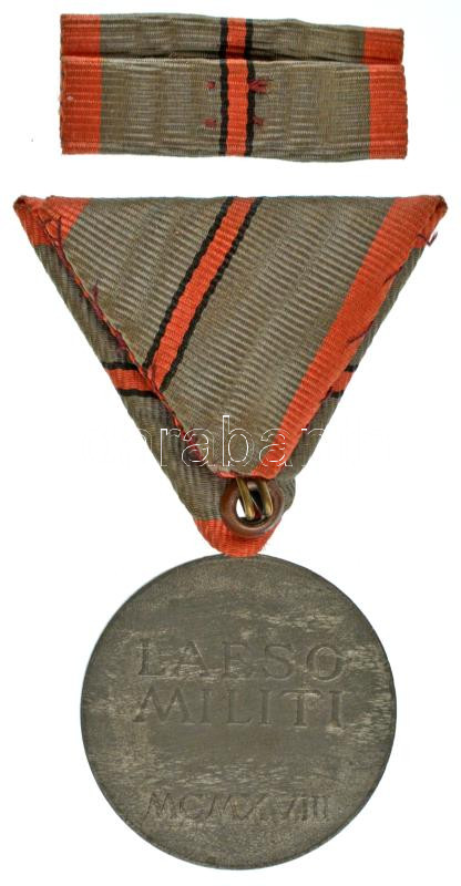 1918. "Sebesültek Érme" Zn kitüntetés egy sebesülés után járó modern mellszalaggal, szalagsávval. Szign.: R. Placht T:AU Hungary 1918. "Wound Medal" Zn decoration with 1st time wound ribbon, with miniature ribbon. Sign.: R. Placht C:AU NMK 328.