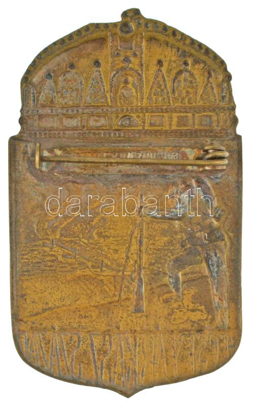 ~1942-1943. "Vécsey Árkász Század" a Vécsey Béla alezredes által parancsnokolt szombathelyi 35. gyalogezred alegységének bronz lemezjelvénye, a hátoldalon a tű rögzítőjén "JELV.GY.KAZINCI U(...)" gyártói jelzéssel (56x34mm) T:AU / Hungary ~1942-1943. "Vécsey Árkász Század (Vécsey Engineers Company)" bronze sheet metal badge of the unit in the 35th Infantry Regiment of Szombathely, commanded by Lt. Colonel Béla Vécsey. On the base of the needle with "JELV.GY.KAZINCI U(...)" maker's mark (56x34mm) C:AU