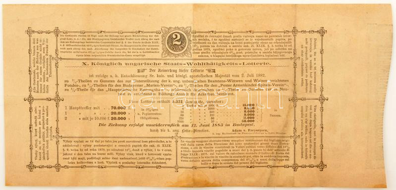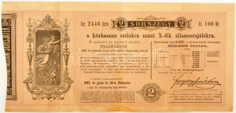 Budapest 1883. "Magyar Lovar-Egylet - Sorsjegy a 'KINCSEM' sorsjátékhoz" sorsjegy szárazpecséttel T:F fo. / Hungary / Budapest 1883. "Hungarian Horse Club - Lottery ticket to the 'KINCSEM' lottery" lottery ticket with embossed stamp C:F spotted