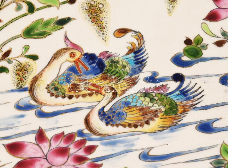 Leírás: 1886 Schütz kerámiagyár kacsamintás dísztányér. Formára korongozott dísztányér, kínai ábrázolásokat idéző állatfigurákat körülölelő virágmintákkal díszítve. Kézzel festett, hátoldalon jelzett: írókázott és masszába nyomott jelzéssel. Hibátlan, d: 17 cm