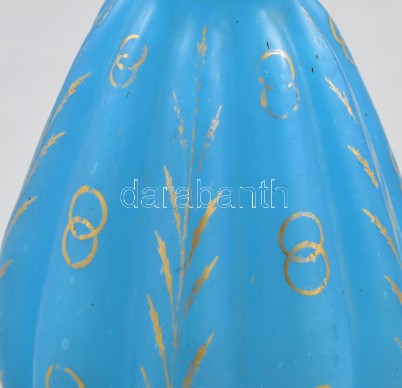 Bécs, 1830 körül, kék opalinüveg italos palack, dugóval, alján becsiszolással, kopott aranyszínű festéssel, hólyagos hasrésszel és dugóval. Kopott, m: 22,5 cm /// "Vienna, circa 1830, blue opaline glass liquor bottle with cork, featuring a cut base, worn gilding, a blistered crack, and the cork. Worn condition. Height: 22.5 cm