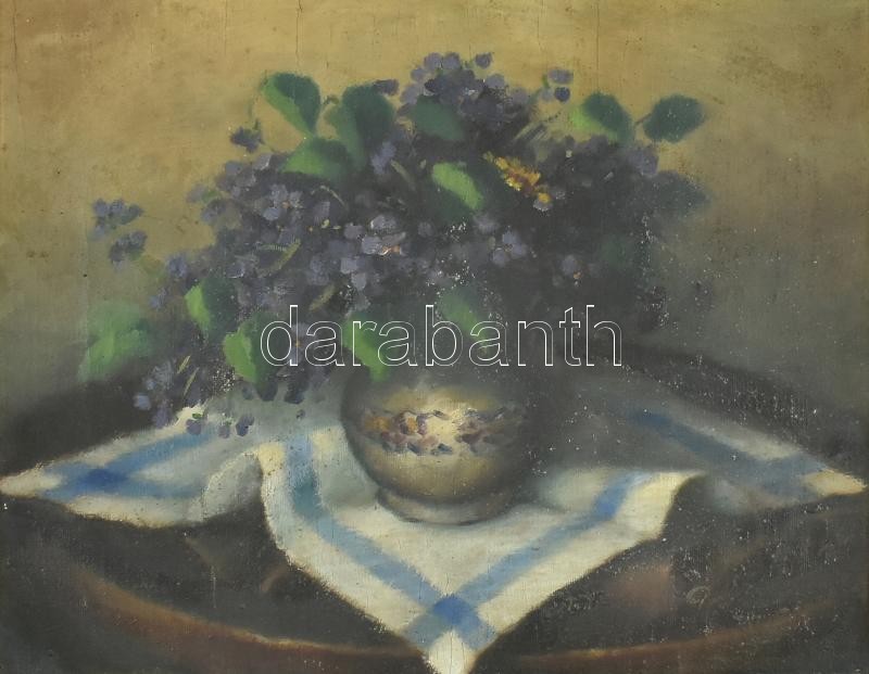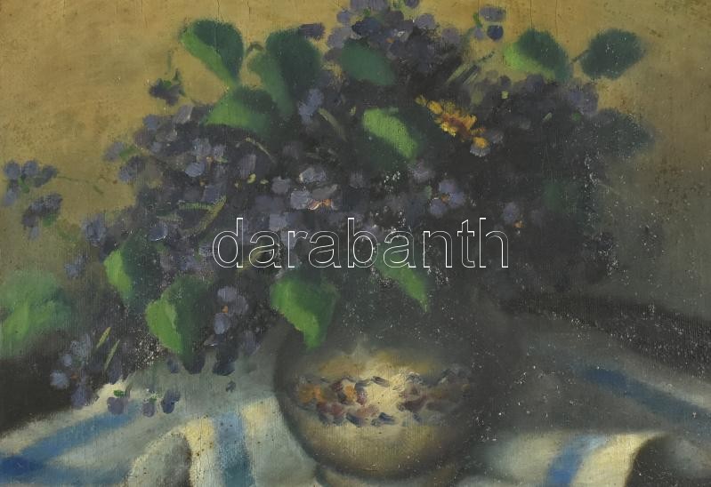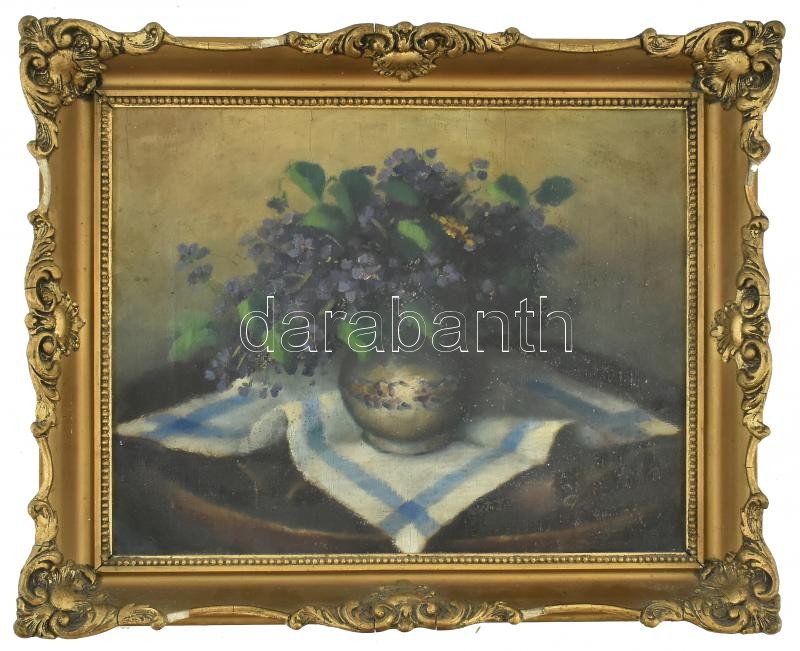 Jelzés nélkül, feltehetően 1930-40 körül működött magyar festő alkotása: Virágcsendélet. Olaj, vászon. Hátoldalán Karsa Kázmér újpesti üveges és képkeretező, "ősmagyar iparos", nyilas bélyegzőjével. Dekoratív, sérült korabeli keretben. 40x50 cm