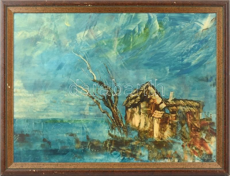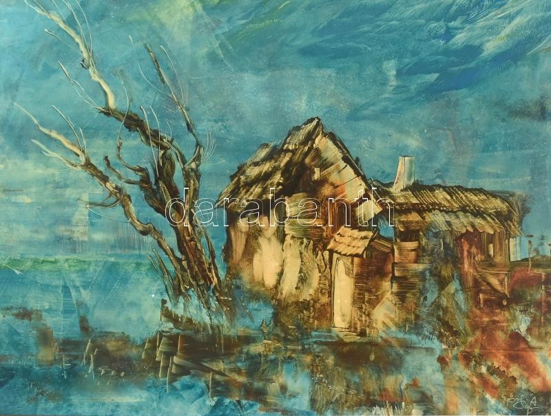 Leírás: Győrfi András (1964-): Tanya, 1995. Olaj, farost, jelzett. Dekoratív, kissé sérült fa keretben, 45×60 cm