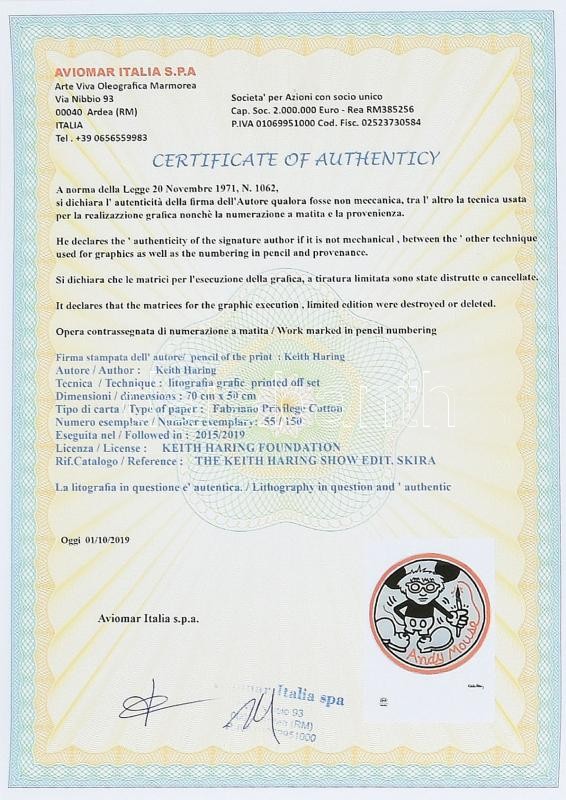 Keith Haring (1958-1990): Andy mouse. Ofszet papír, jelzett a nyomaton. Számozott: 55/150. Tanúsítvánnyal Lapméret: 70x50 cm/ Numbered, marked 70x50 cm