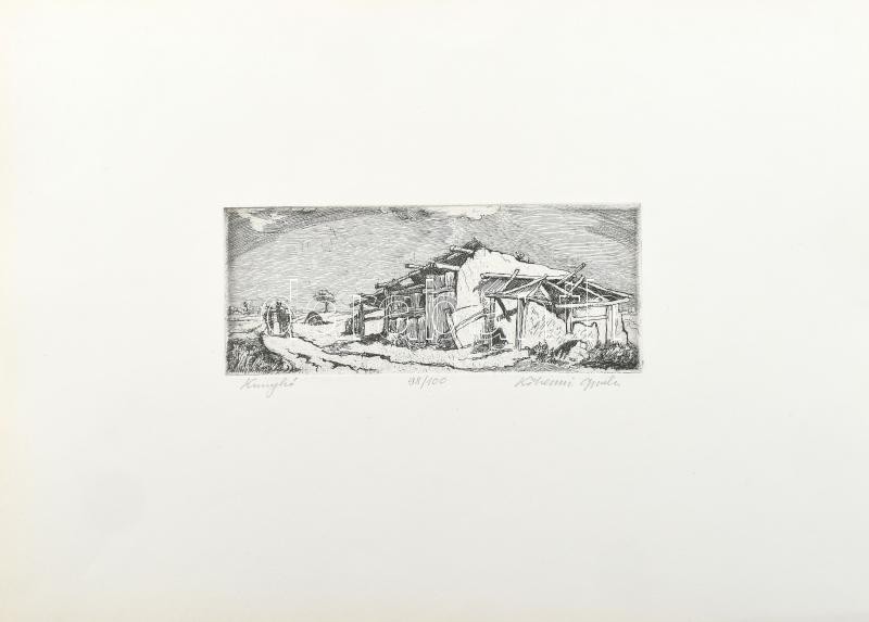 Leírás: Kőhegyi Gyula (1933- ): Kunyhó. Rézkarc, papír, jelzett, számozott (98/100), 7,5×19 cm