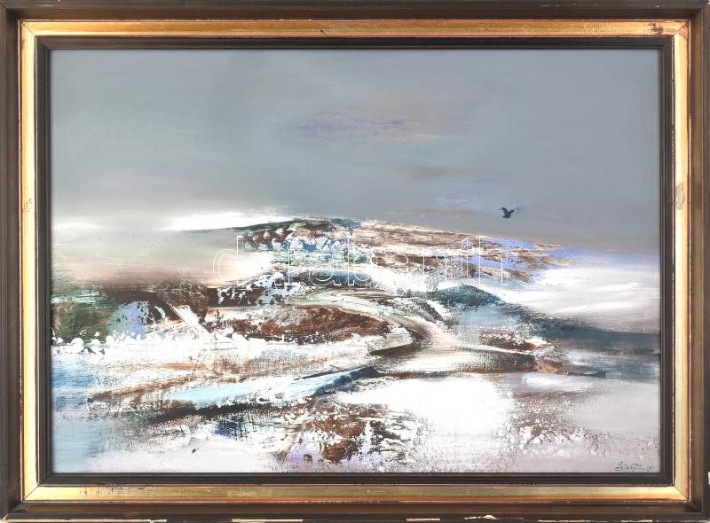 Leírás: Pataki Ferenc (1941-): Behavazott utak. Olaj, farost, jelzett, keretben, 50×70 cm