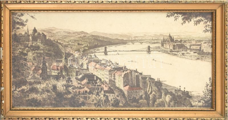 Leírás: Zádor István (1882-1963): Budapest látképe, 1928. Színezett rézkarc, papír, jelzett. Dekoratív, sérült, üvegezett keretben, 48,5x24 cm